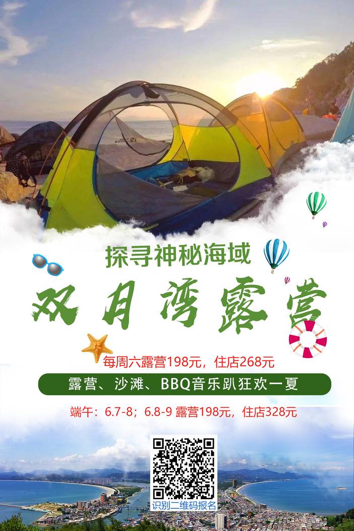 6.7-8;6.8-9双月湾十里沙滩,烧烤,篝火晚会,大星山,露营198住店328