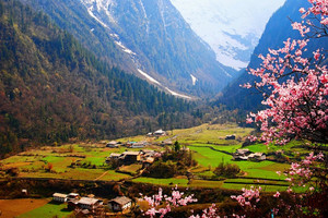 三江并流,涮走了烟云,带去了流沙,淘尽了污浊,孕育出如莲的美景。这里,少女的流盼梳理着花朵;阳光抚摸每一道生命的年轮;天鹅的翅膀将蓝天的白云剪成花环。
