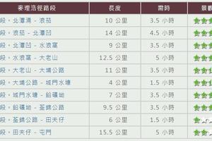 在香港有一条著名的徒步线路——麦理浩径,这条线路是1979年10月26日启用,全长100公里。以西贡北潭涌为起点,绕过万宜水库,由东向西横贯新界,以屯门为终点,共分为十段。沿途有路标指示牌,每段都有报到处和休息处。 麦理浩径横跨香港24个郊野公园中的8个,沿途要翻越二十多座山头,如420米的牛耳石山、702米的马鞍山、649米的草山和957米的大帽山等。全程风景各异,不论山岭、岸边、丛林、溪涧,全都美丽得叫人叹为观止。