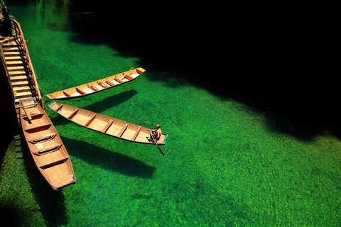 屏山峡谷深达百余丈,溪水碧蓝清澈见底;如果遇到晴天,阳光折射入水面,行舟于上宛如悬浮在空中一般。适时乘船游览,小舟行驶在峡谷底部的水面上滑动,宛如悬浮在空中一般。我们一眼可以望到清澈的水底,这里的美依然令人沉醉。