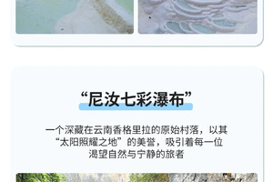 徒步起点位于普达措属都湖畔,在这里候鸟成群,森林和水构成一幅美丽的画卷,随着爬升我们进入到原始森林,参天的树和各样的苔藓、松萝,五月森林里的杜鹃竞相开放,穿过树林我们就来到地基唐,经过500的爬升到草场便可以放松下来,夏天这里是一片花海,秋天又变成一片金黄,穿过德吉牧场我们离七彩瀑布越来越近,潺潺溪流在树林光影的配合下显得更加梦幻,仿佛闯入了绿野仙踪,尼汝河伴随这我们走完最后一段路程,不同的瀑布从台地上飞流直下。更为奇妙的是,宽大的台地上千年沉积的碳酸钙等矿物质色彩斑斓,抵达尼汝村后,可享用当地特色美食,体验最原始的藏族村落。